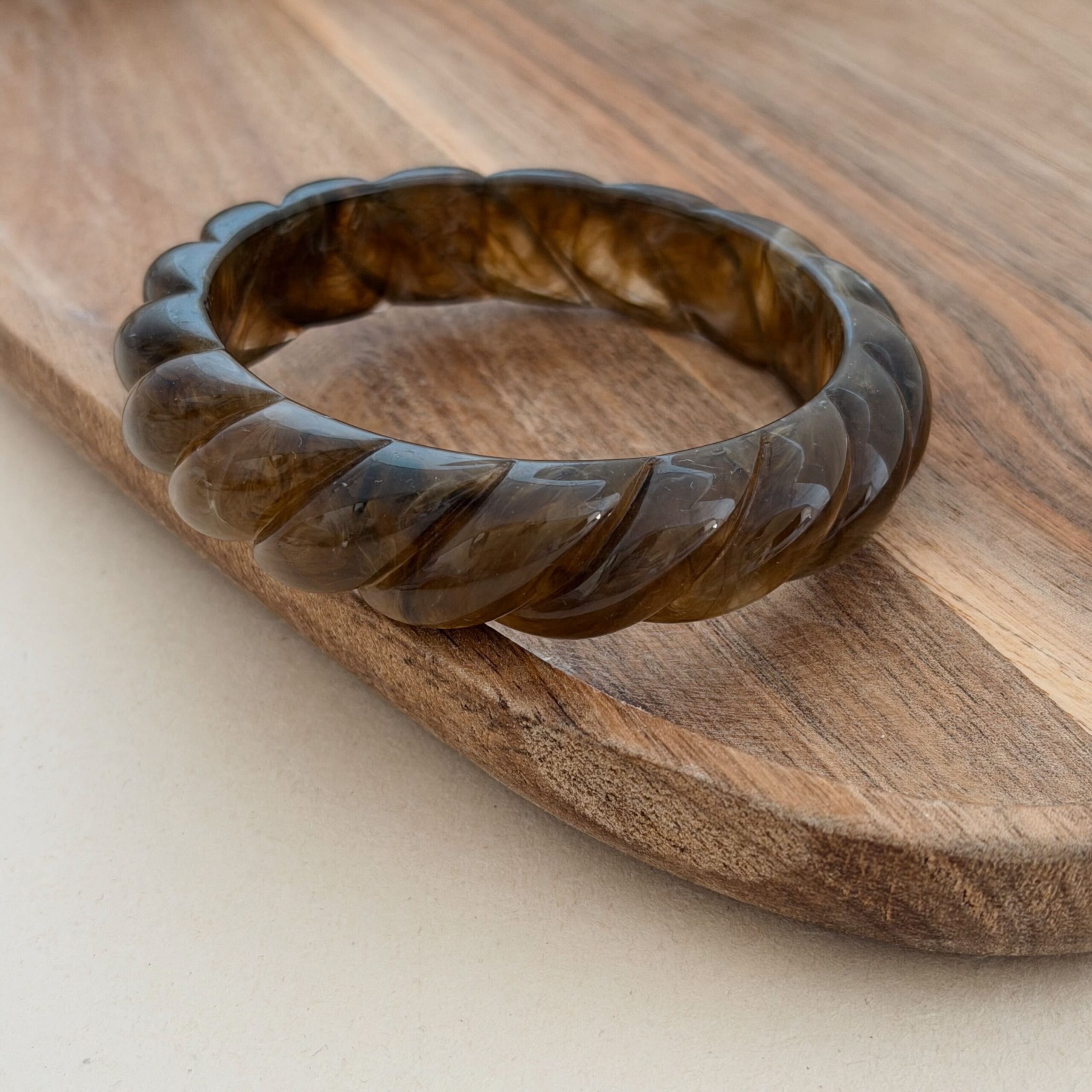 - Design : Le bijou est en résine avec un effet torsadé, le jonc est de coloris marron foncé légèrement nuancé