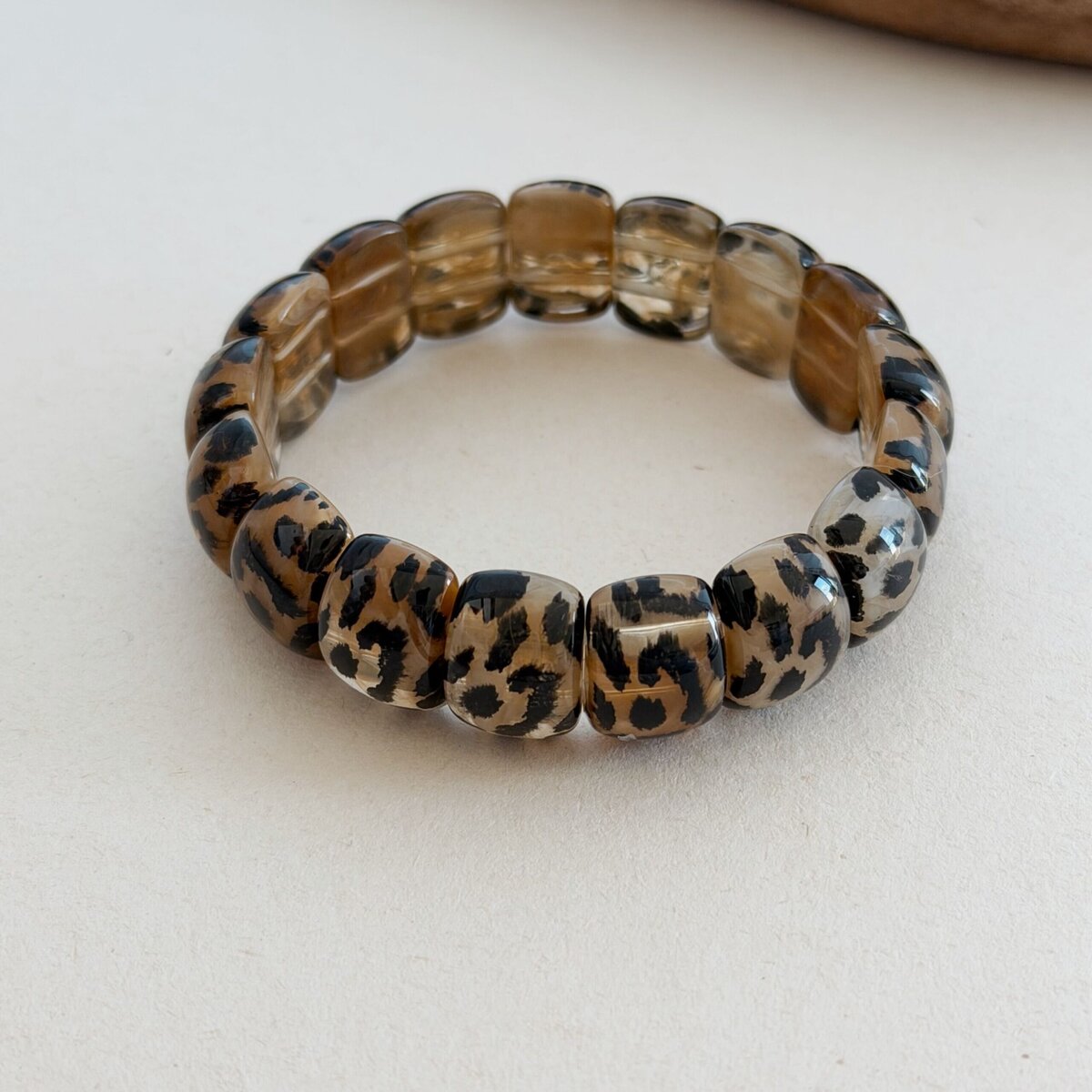 - Design : Le bijou se compose de perles en acétate nuancé motif léopard