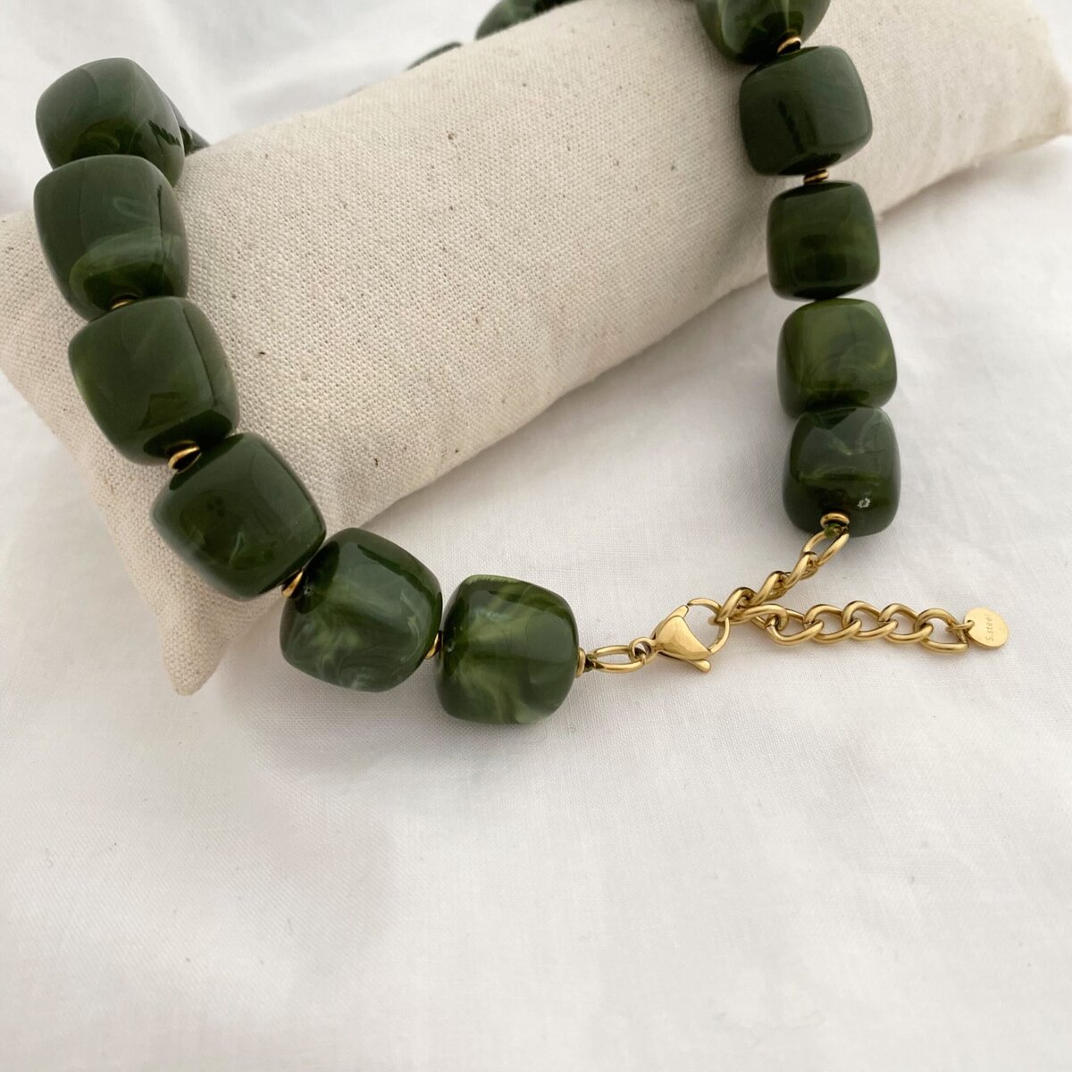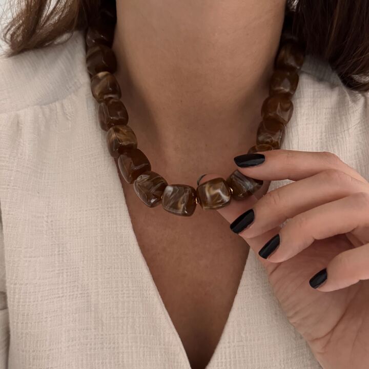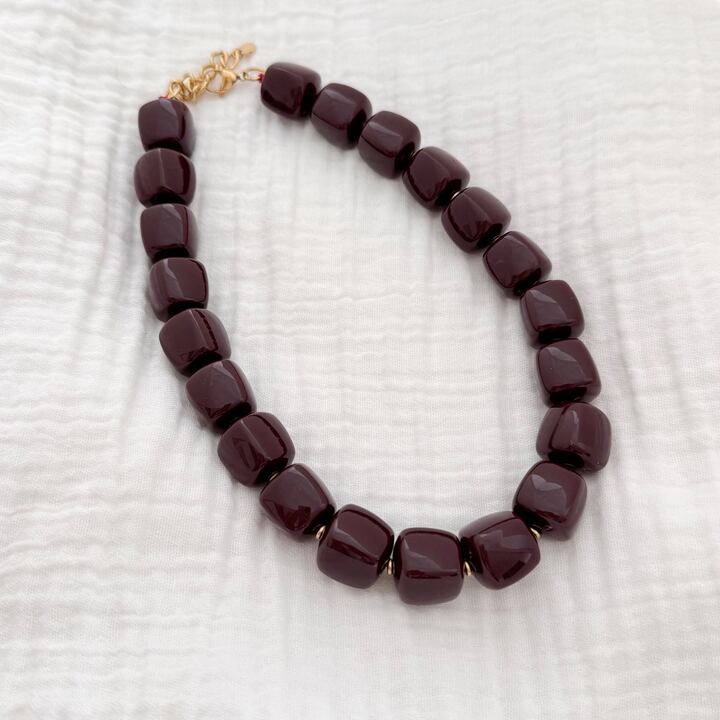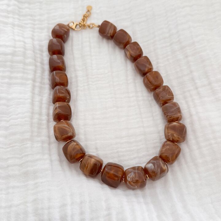 - Design : Le bijou se compose de perles en acétate légèrement marbrées pour tous les coloris sauf le prune