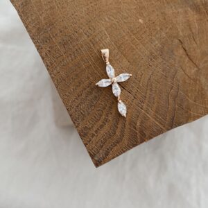 - Le bijou se compose d’une chaîne torsadée au fini brillant décorée d’un pendentif en forme de croix et oxydes de zirconium