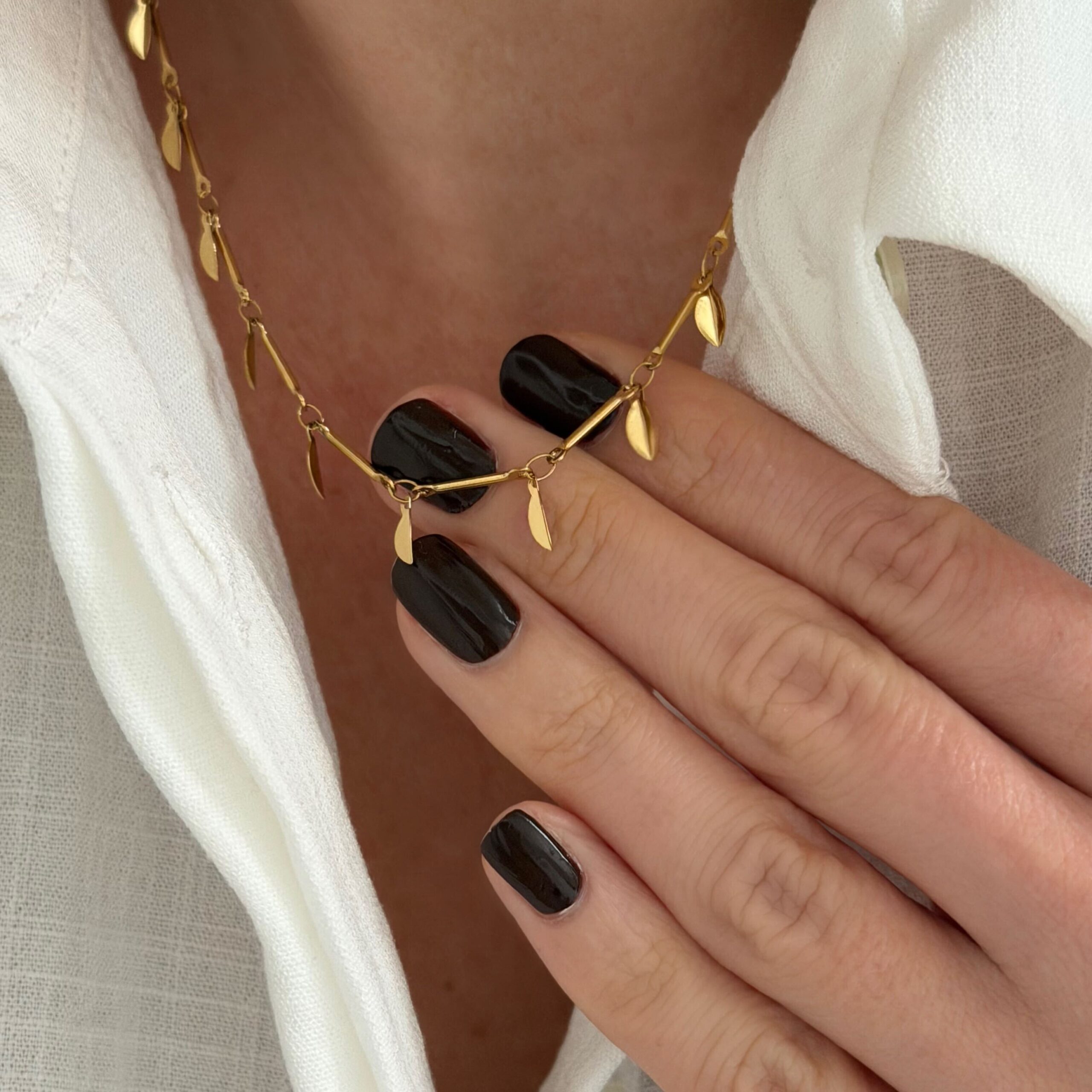 - Le bijou se compose d’une chaîne originale décorée de petites pampilles au motif feuilles
